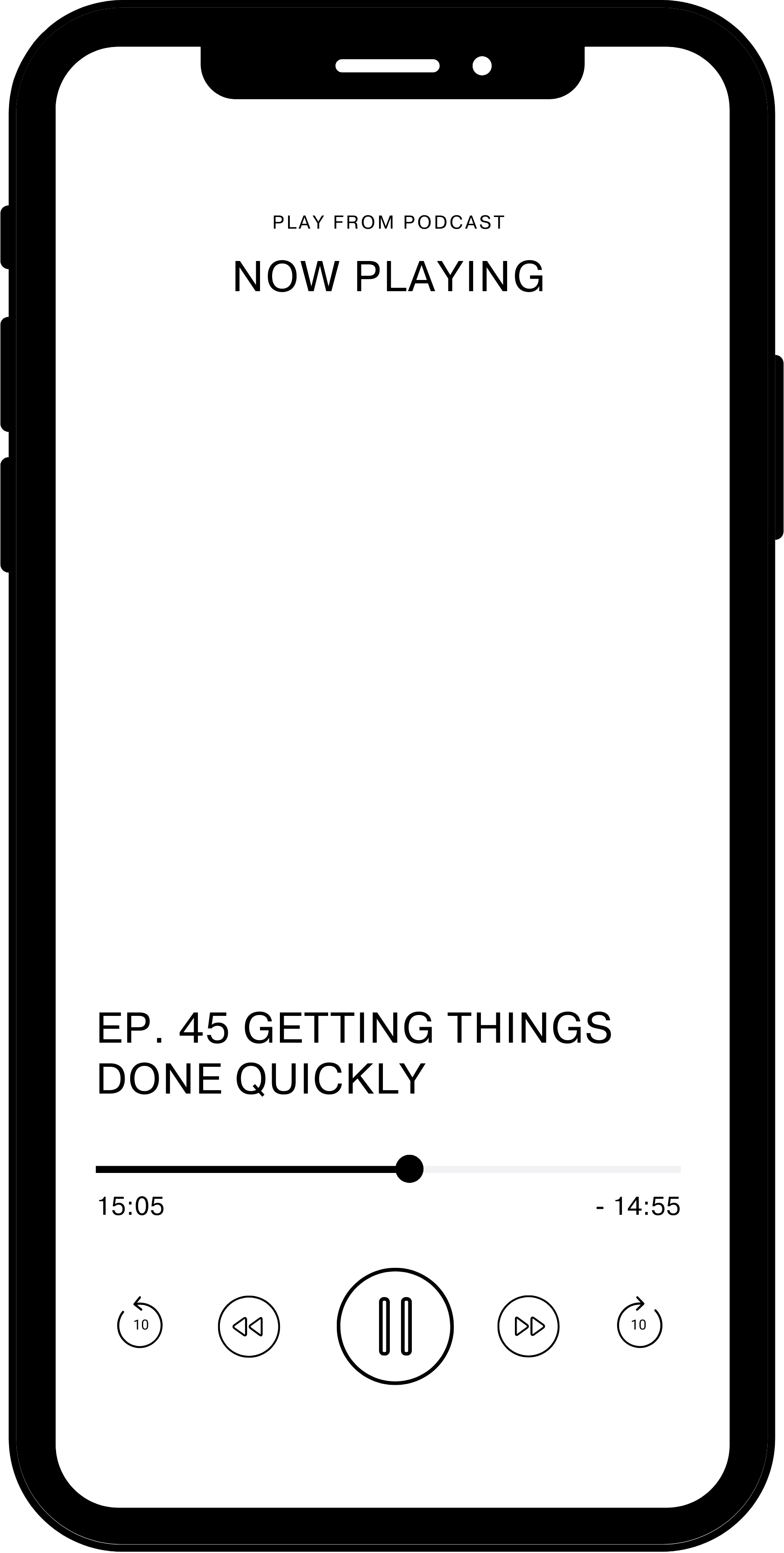 A smartphone displaying a podcast playing screen with the episode title "EP. 45 GETTING THINGS DONE QUICKLY," time indicator, rewind, forward, pause, and volume controls.
