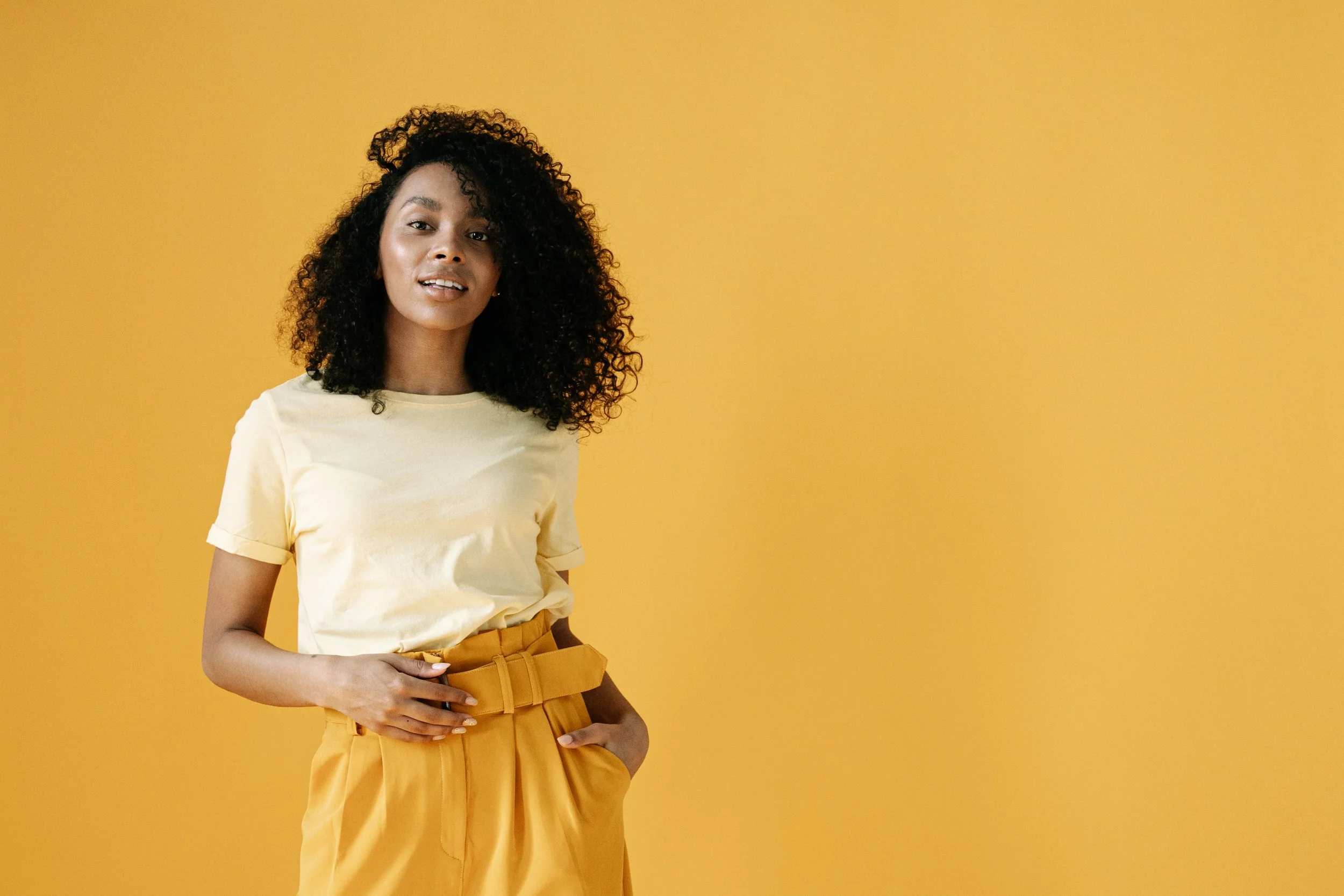 A young woman with curly black hair wearing a yellow T-shirt and high-waisted yellow pants, standing against a solid yellow background.