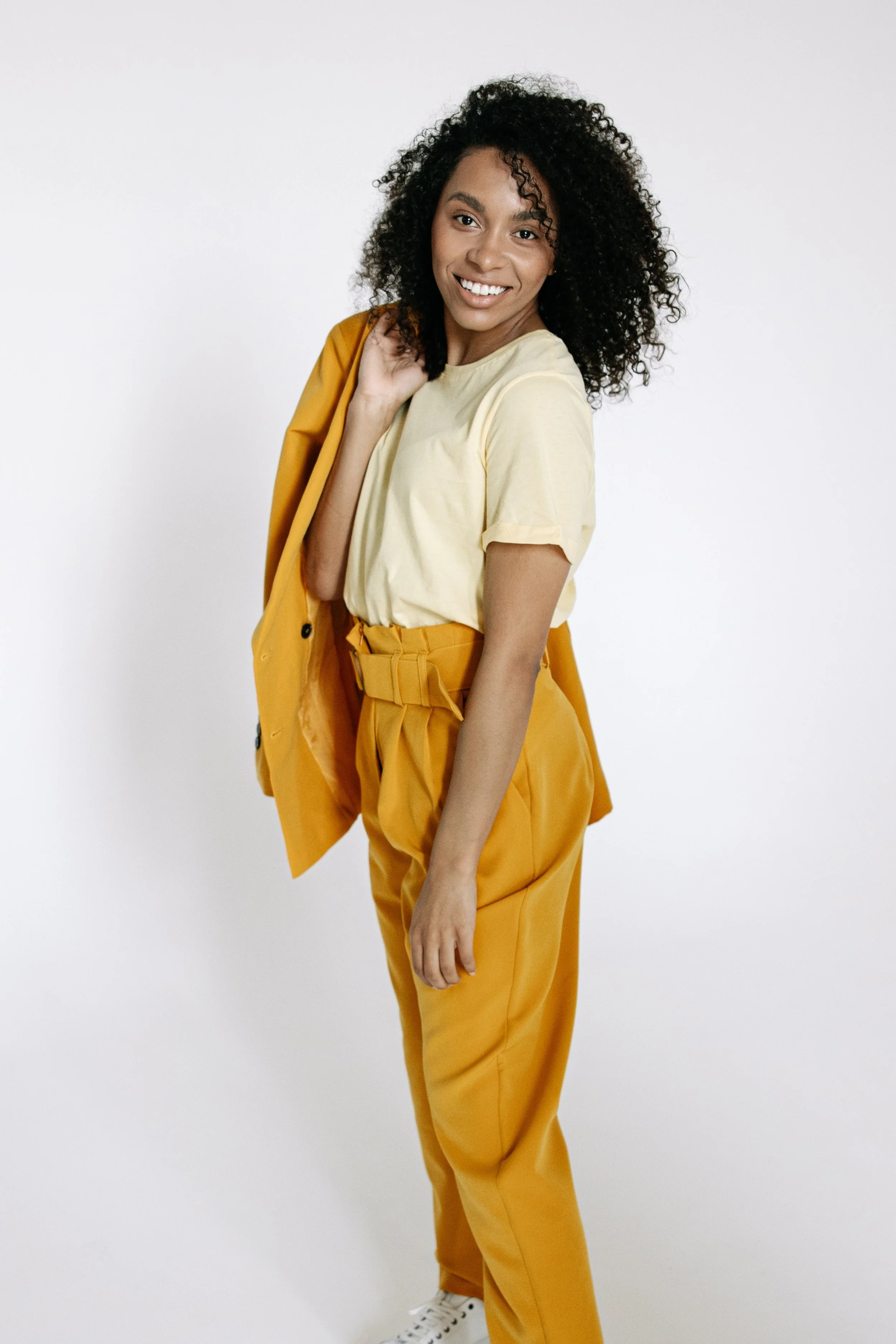 A woman with curly hair is smiling and looking to her left, holding a yellow blazer over her shoulder, wearing yellow pants and a yellow top against a plain white background.